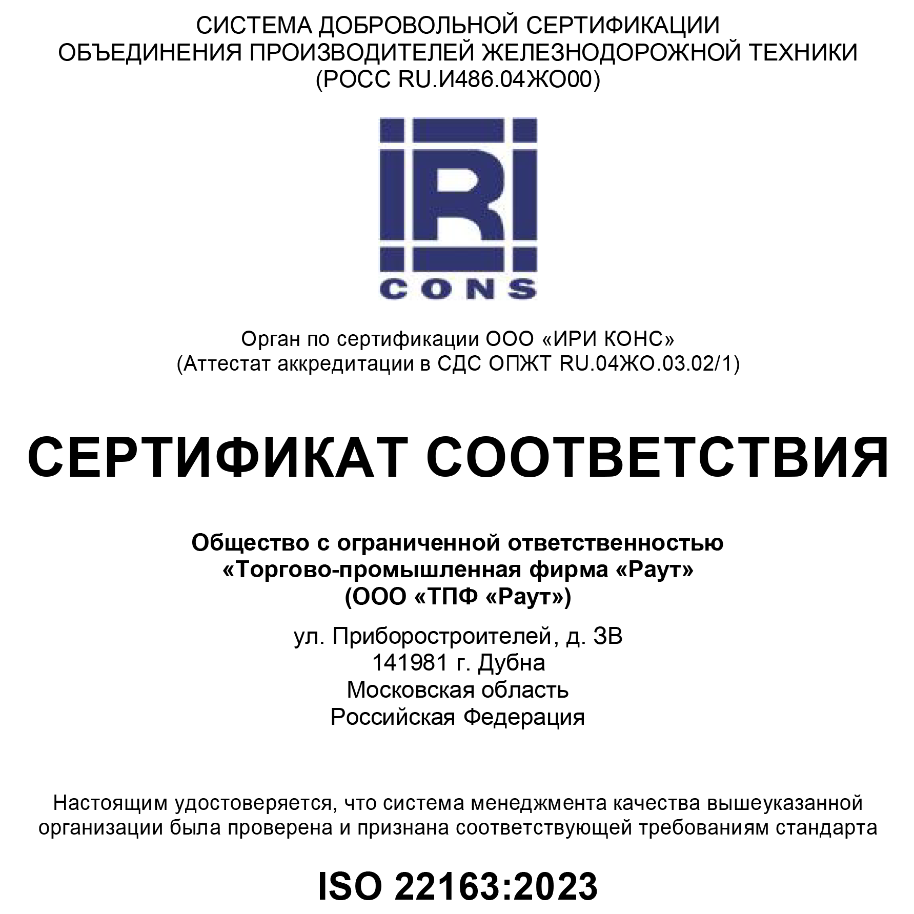 Система менеджмента ООО "ТПФ РАУТ" признана соответствующей требованиям стандарта ISO 22163:2023. Область сертификации. Проектирование и разработка, изготовление, техническое обслуживание и ремонт компонентов интерьера для железнодорожного подвижного состава. Сертификат действителен по 2027-02-09.